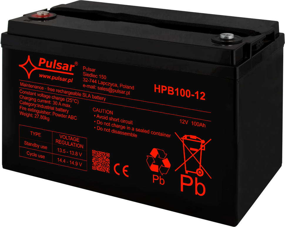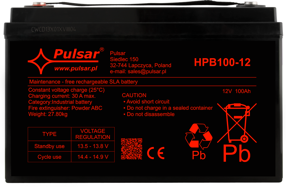 Akumulator z serii HPB marki Pulsar to bezobsługowy VRLA w technologii AGM (Absorbent Glass Mat) do pracy buforowej i cyklicznej. Sprawdza się jako źródło zasilania 12V w systemach CCTV, SSWiN, kontroli dostępu (KD), DSO oraz w zasilaczach buforowych i UPS – gdy wymagane jest podtrzymanie napięcia podczas braku zasilania podstawowego. Seria HPB jest projektowana z myślą o profesjonalnych instalacjach bezpieczeństwa.