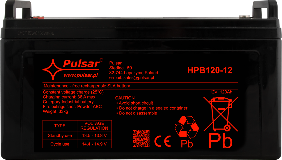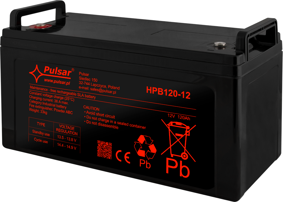 Akumulator z serii HPB marki Pulsar to bezobsługowy VRLA w technologii AGM (Absorbent Glass Mat) do pracy buforowej i cyklicznej. Sprawdza się jako źródło zasilania 12V w systemach CCTV, SSWiN, kontroli dostępu (KD), DSO oraz w zasilaczach buforowych i UPS – gdy wymagane jest podtrzymanie napięcia podczas braku zasilania podstawowego. Seria HPB jest projektowana z myślą o profesjonalnych instalacjach bezpieczeństwa.