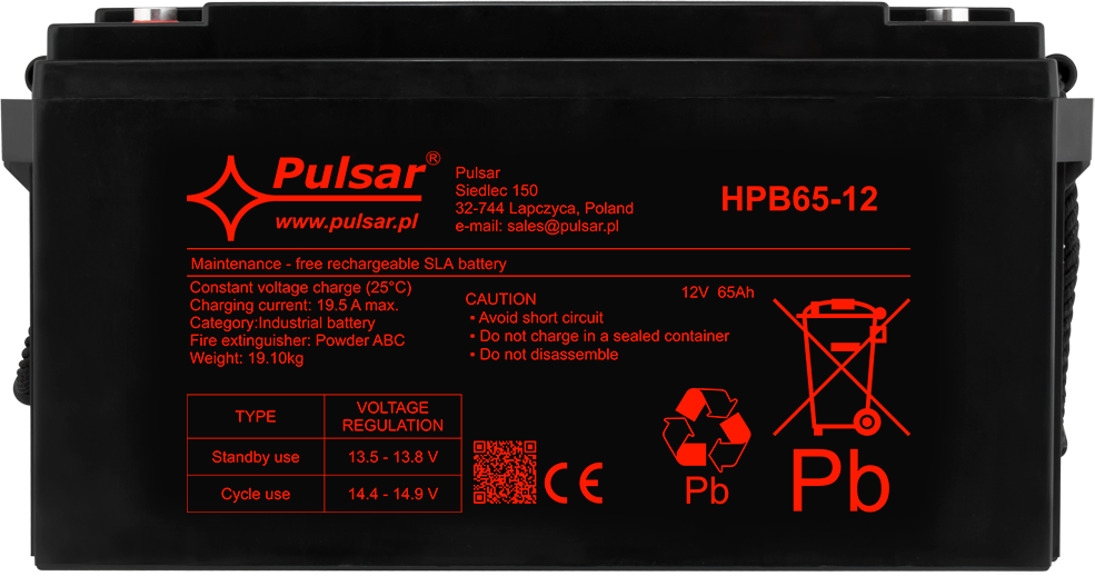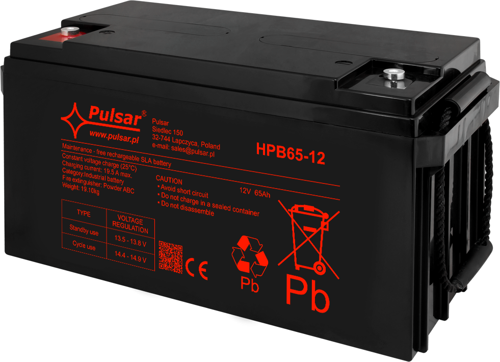 Akumulator z serii HPB marki Pulsar to bezobsługowy VRLA w technologii AGM (Absorbent Glass Mat) do pracy buforowej i cyklicznej. Sprawdza się jako źródło zasilania 12V w systemach CCTV, SSWiN, kontroli dostępu (KD), DSO oraz w zasilaczach buforowych i UPS – gdy wymagane jest podtrzymanie napięcia podczas braku zasilania podstawowego. Seria HPB powstała do zastosowań profesjonalnych w instalacjach bezpieczeństwa.