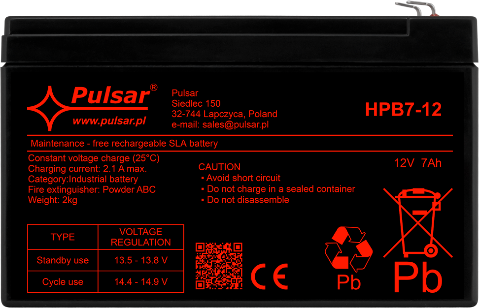 Akumulator z serii HPB marki Pulsar to bezobsługowy VRLA w technologii AGM (Absorbent Glass Mat) do pracy buforowej i cyklicznej. Sprawdza się jako źródło zasilania 12V w systemach CCTV, SSWiN, kontroli dostępu (KD), DSO oraz w zasilaczach buforowych i UPS – gdy wymagane jest podtrzymanie napięcia podczas braku zasilania podstawowego. Seria HPB to produkty spełniające normy branżowe i projektowane do profesjonalnych zastosowań.