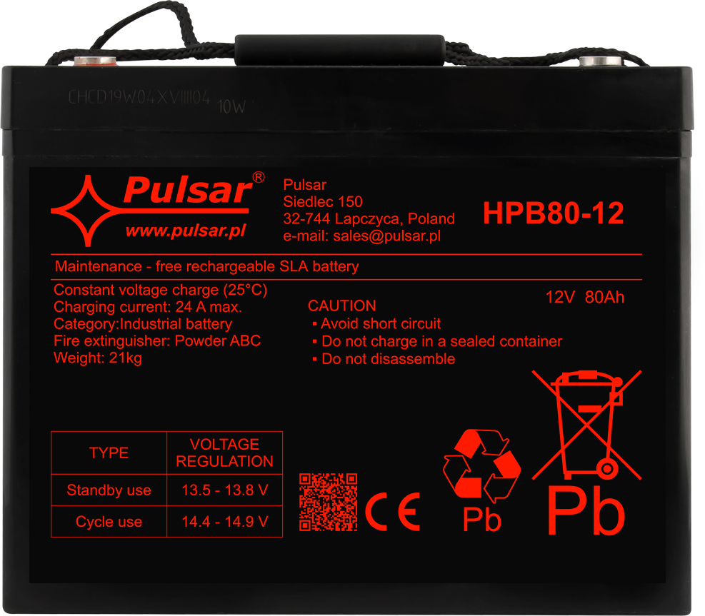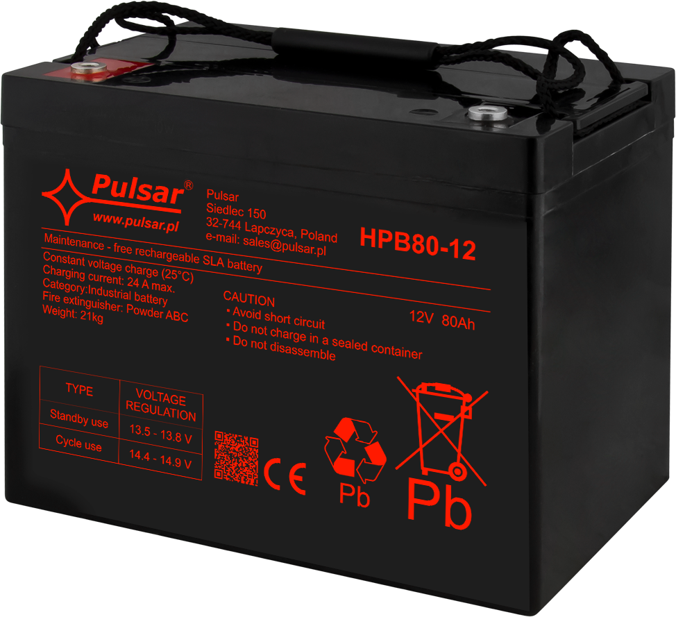 Akumulator z serii HPB marki Pulsar to bezobsługowy VRLA w technologii AGM (Absorbent Glass Mat) do pracy buforowej i cyklicznej. Sprawdza się jako źródło zasilania 12V w systemach CCTV, SSWiN, kontroli dostępu (KD), DSO, a także w zasilaczach buforowych i UPS – wszędzie tam, gdzie wymagane jest pewne podtrzymanie napięcia podczas zaniku zasilania. Model HPB80-12 objęty jest deklaracją zgodności producenta (baterie/akumulatory – rozporządzenie (UE) 2023/1542 oraz właściwe normy).