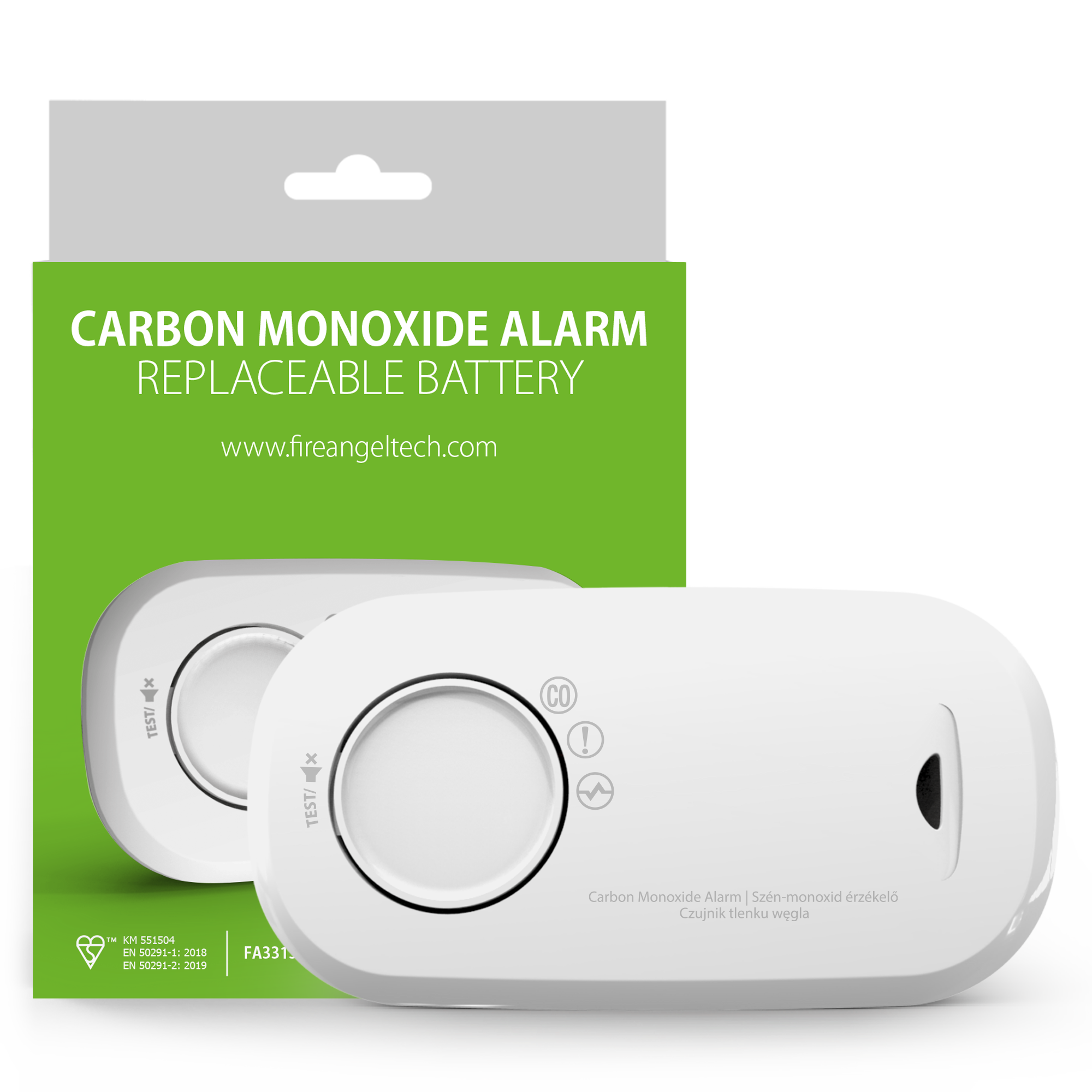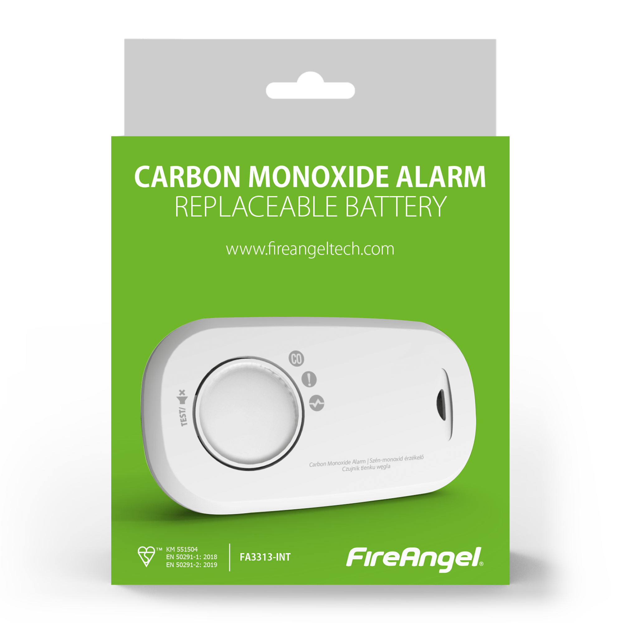 Czujnik tlenku węgla (czadu) FA3313-INT, FIREANGEL czujnik z zaawansowanym sensorem elektrochemicznym, alarmem 85 dB, pamięcią alarmu i 10-letnią żywotnością. Zasilany dwiema bateriami AA, przeznaczony do montażu ściennego lub użytkowania jako czujnik przenośny.