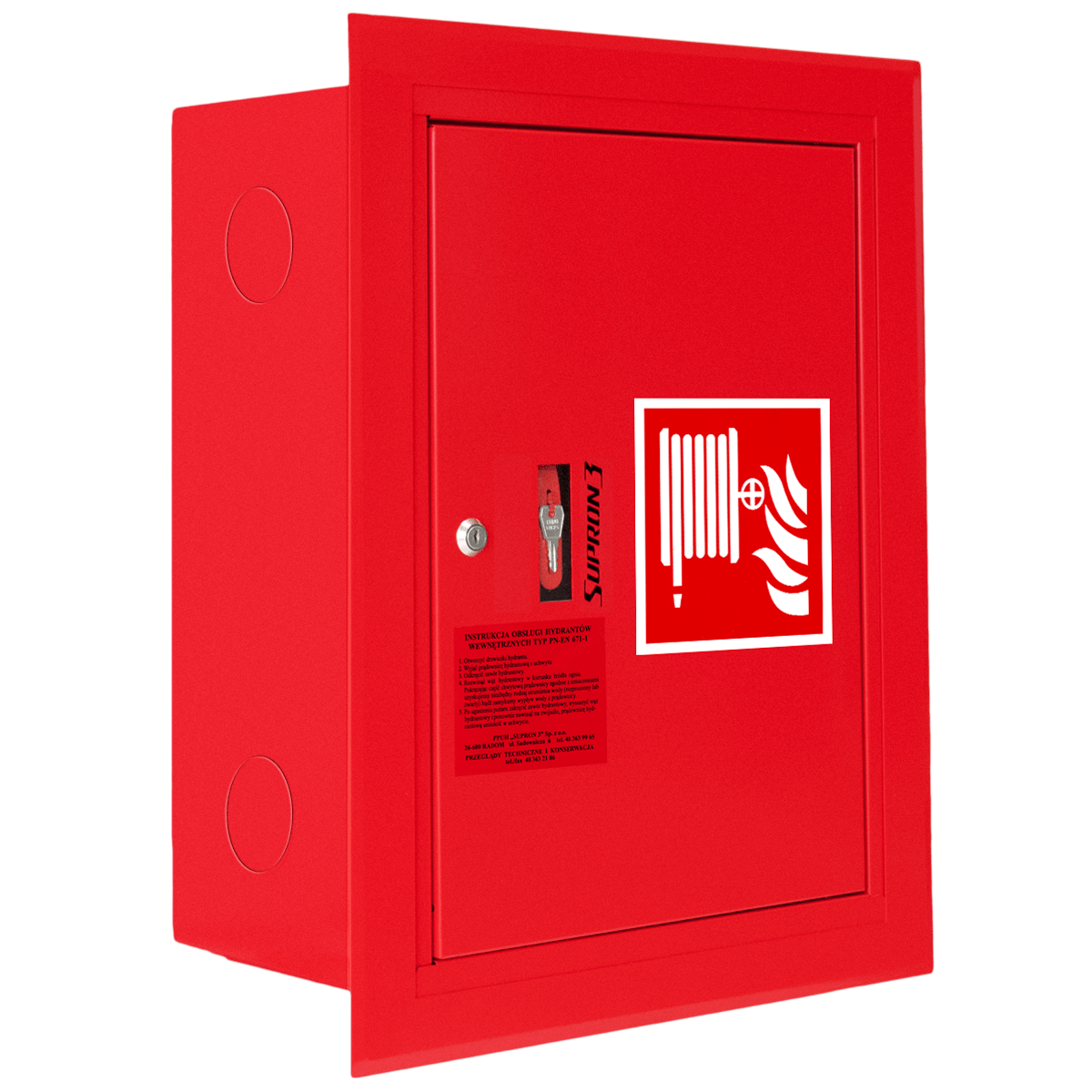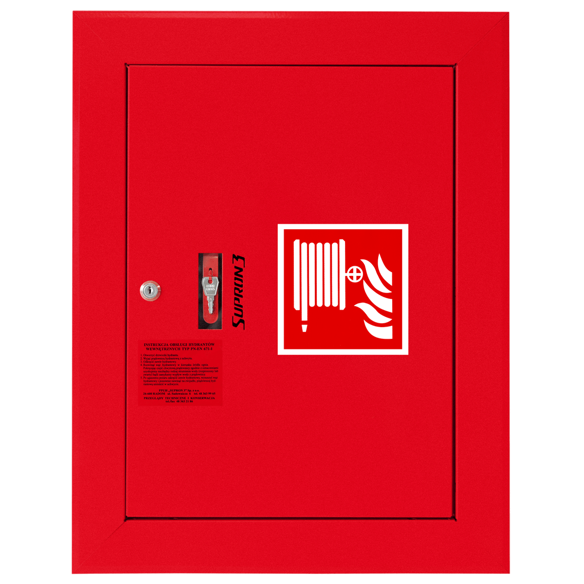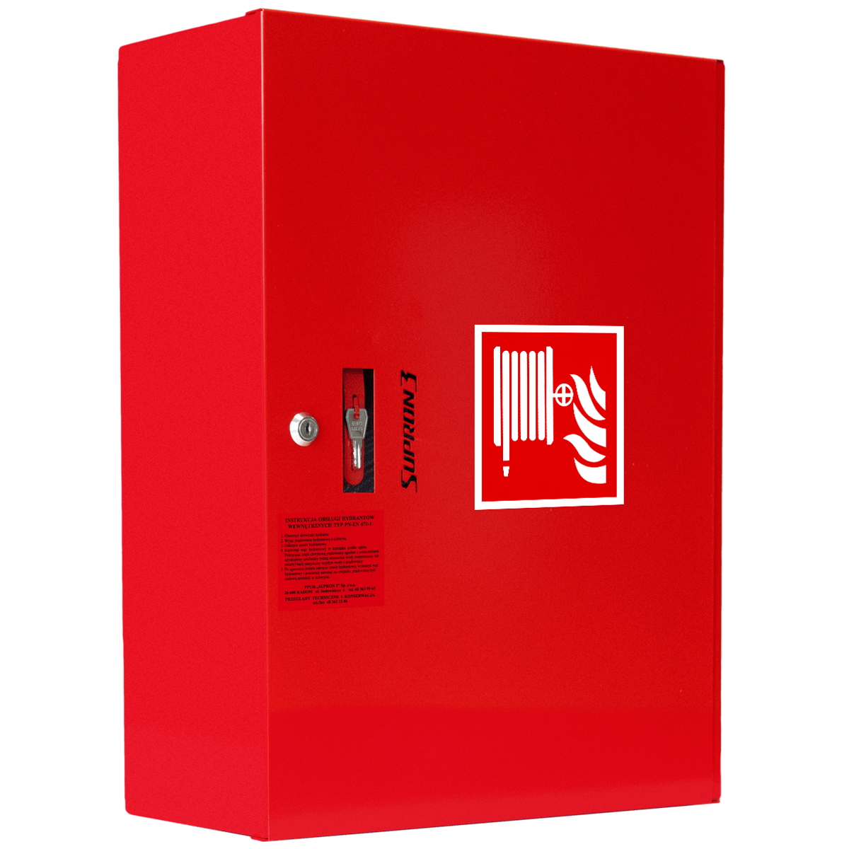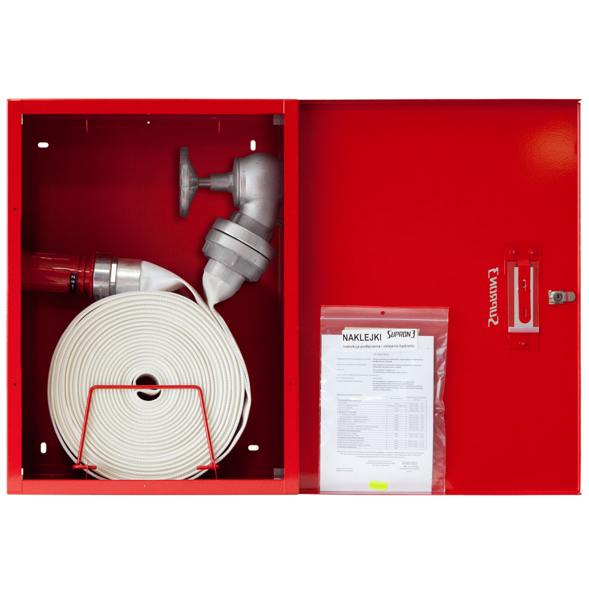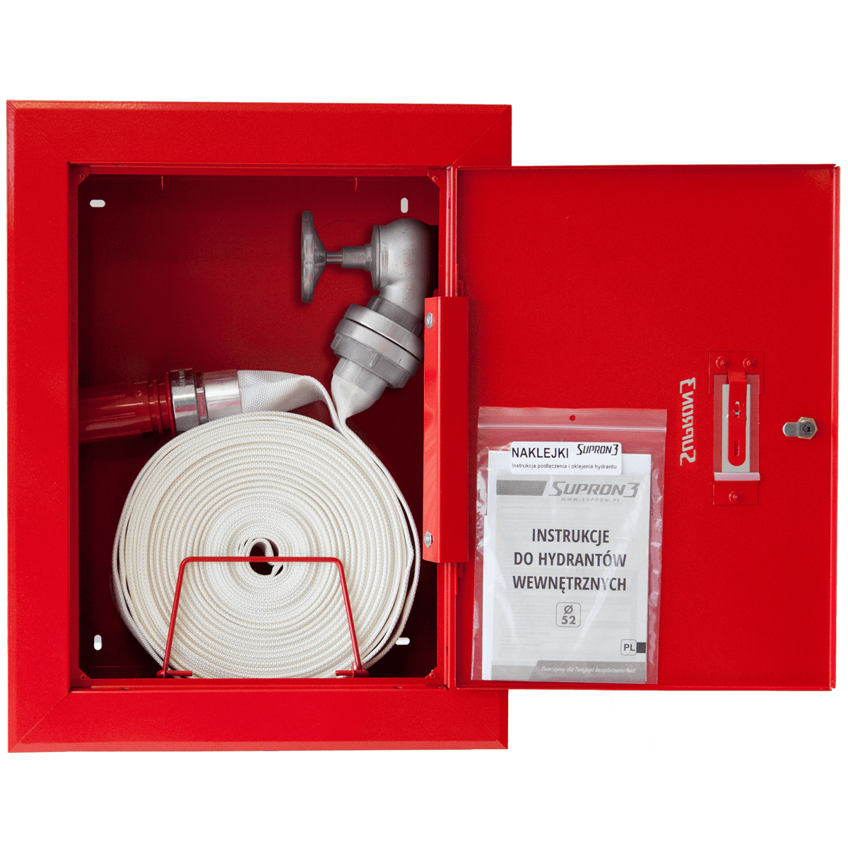 Hydrant wewnętrzny DN52 Supron 3 to certyfikowane urządzenie przeciwpożarowe przeznaczone do instalacji w budynkach mieszkalnych, obiektach użyteczności publicznej, halach przemysłowych i magazynowych. Model ten wyposażony jest w wąż tłoczny płasko składany Ø52 mm o długości 15 m lub 20 m, zwinięty w szafce hydrantowej. Wersja uniwersalna hydrantu umożliwia montaż hydrantu w wykonaniu lewym lub prawym, a wszystkie otwory przyłączeniowe są fabrycznie zaślepione, co daje szerokie możliwości podłączenia do instalacji.