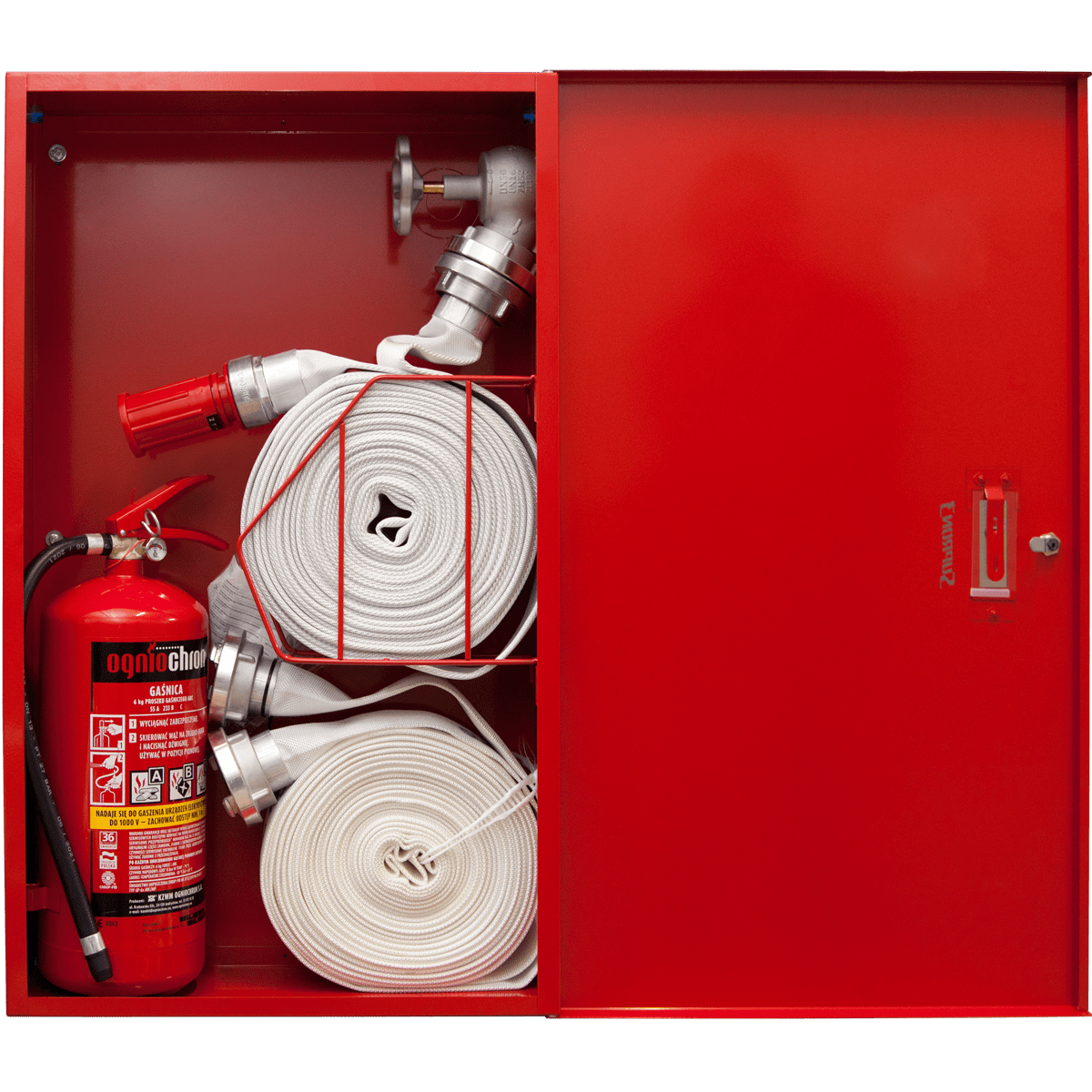 Hydrant wewnętrzny DN52 z dodatkowym wężem i miejscem na gaśnicę to certyfikowane urządzenie przeciwpożarowe przeznaczone do instalacji w budynkach użyteczności publicznej, obiektach handlowych i przemysłowych, halach magazynowych oraz garażach podziemnych. Ten model hydrantu wyposażony jest w dwa węże tłoczne płasko składane Ø 52mm o długości 15m lub20 m, ułożone w koszu i pod koszem szafki hydrantowej. Dodatkowo konstrukcja posiada wydzielone miejsce na gaśnicę o pojemności 6 kg, co zwiększa bezpieczeństwo i funkcjonalność urządzenia.
