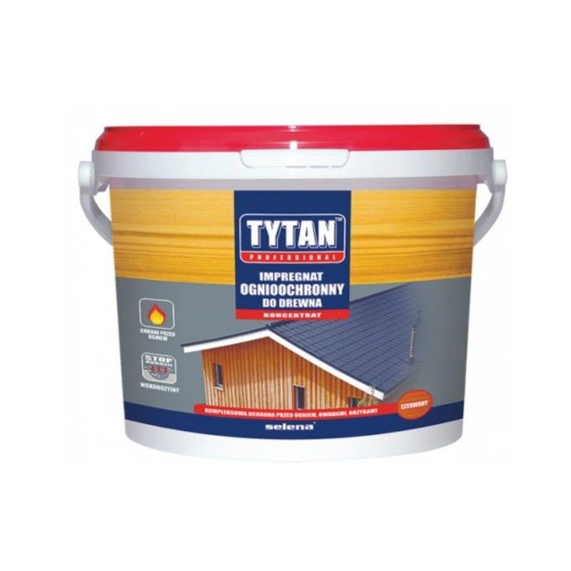 Impregnat ogniochronny TYTAN to preparat do zabezpieczania drewna i materiałów drewnopochodnych przed działaniem ognia. Dzięki obecności związków boru, fosforanów i siarczanów środek skutecznie ogranicza rozprzestrzenianie płomienia oraz zmniejsza palność drewna. Preparat charakteryzuje się wysoką skutecznością, głęboką penetracją i trwałością ochrony, utrzymując właściwości ogniowe przez cały okres eksploatacji elementu drewnianego, o ile nie jest on narażony na wymywanie przez wodę.