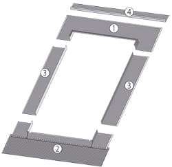 Kołnierz uszczelniający EBS-P składa się z czterech elementów: górnego, dolnego oraz dwóch rynien bocznych. Dolny element posiada zintegrowany fartuch ołowiany, który dopasowuje się do powierzchni pokrycia i zapewnia szczelność połączenia.