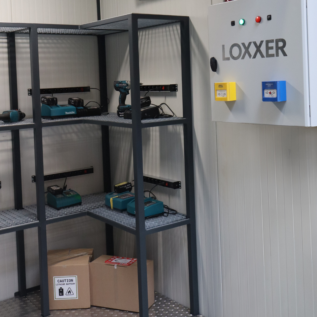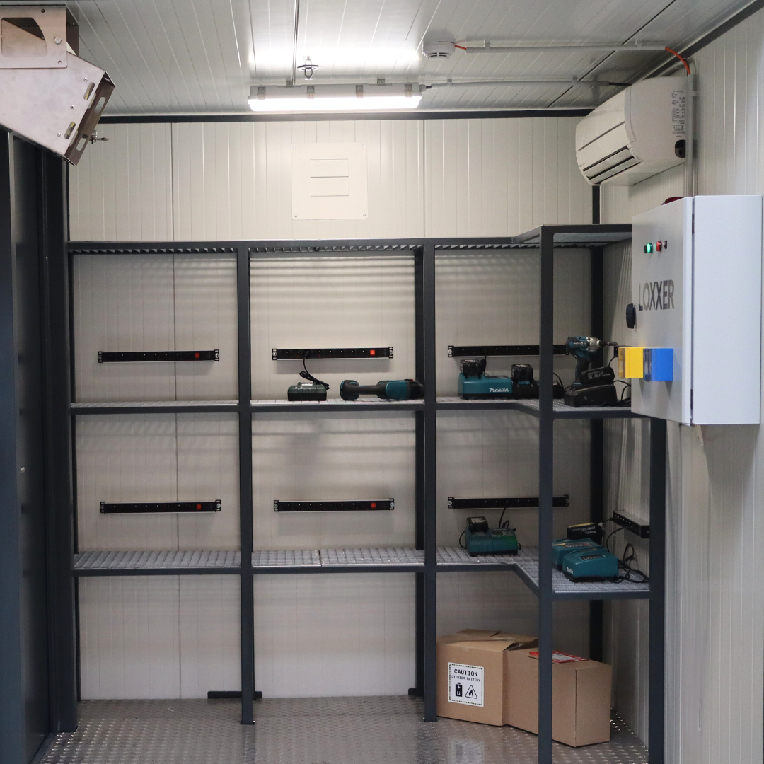 Kontener typu WALK-IN, LOXXER ognioodporna konstrukcja przeznaczona do bezpiecznego przechowywania akumulatorów litowo-jonowych oraz sprzętu elektrycznego. Dzięki odporności ogniowej do 120 minut, możliwości doposażenia w czujniki dymu, systemy tryskaczowe, aerozolowy system gaśniczy i regulację temperatury zapewnia stabilne i kontrolowane warunki pracy w obiektach technicznych, magazynowych i serwisowych.