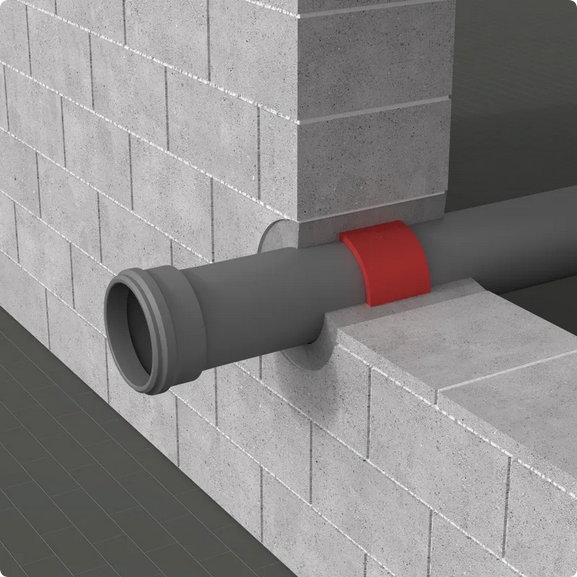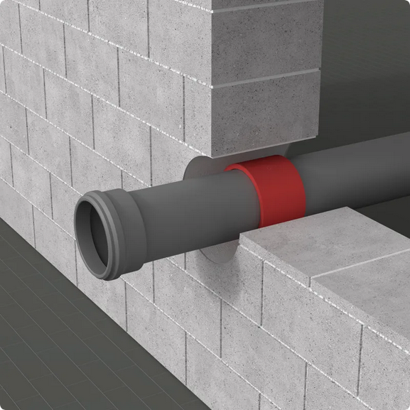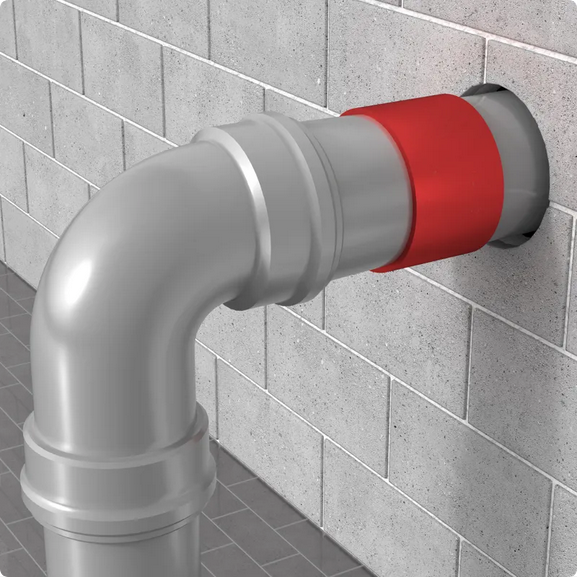 Opaska ogniochronna INTU FR WRAP do zabezpieczania przejść rur palnych i niepalnych przez ściany i stropy o odporności ogniowej do EI240. Wkład grafitowy pęczniejący w temperaturze 140°C, prosty montaż i szeroki zakres średnic od 32 do 200 mm.