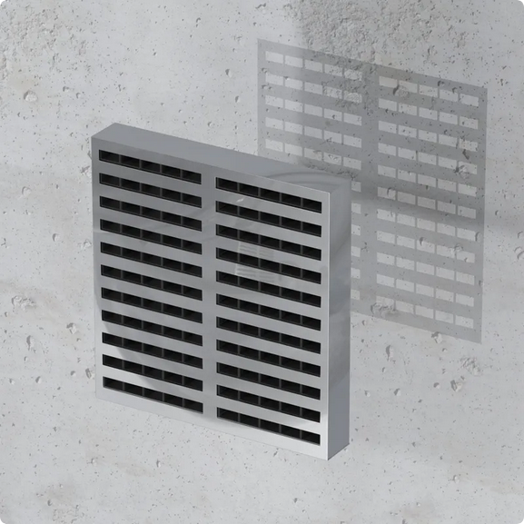 ALFA FR GRILLE – prostokątna, pęczniejąca kratka wentylacyjna do ścian i stropów sztywnych. W normalnej pracy zapewnia przepływ powietrza, a w czasie pożaru element ekspandujący pęcznieje (≥140°C), całkowicie zamyka otwór i przywraca przegrodzie ogniochronność w klasach EI60 / EI120 / EI240 (w zależności od doboru kratki).