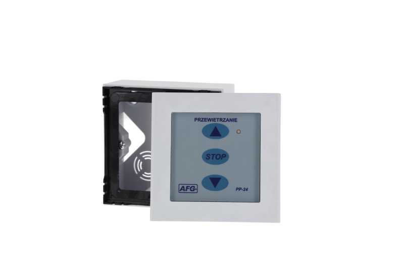 Przycisk przewietrzania PP-24 to urządzenie natynkowe AFG przeznaczone do ręcznego sterowania położenia klap dymowych w funkcji wentylowania i przewietrzania pomieszczeń. Przełącznik przewietrzania umożliwia otwieranie, zamykanie i zatrzymywanie ruchomych segmentów wyciągów dymu w dowolnym położeniu.