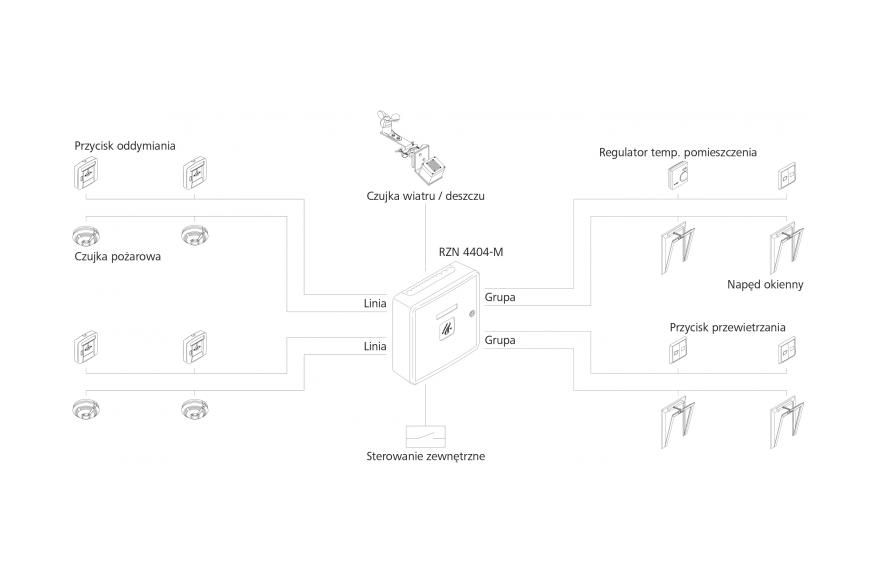 Centrala współpracuje z napędami okiennymi, przyciskami oddymiania, czujkami pożarowymi, czujkami pogodowymi oraz modułami temperatury.