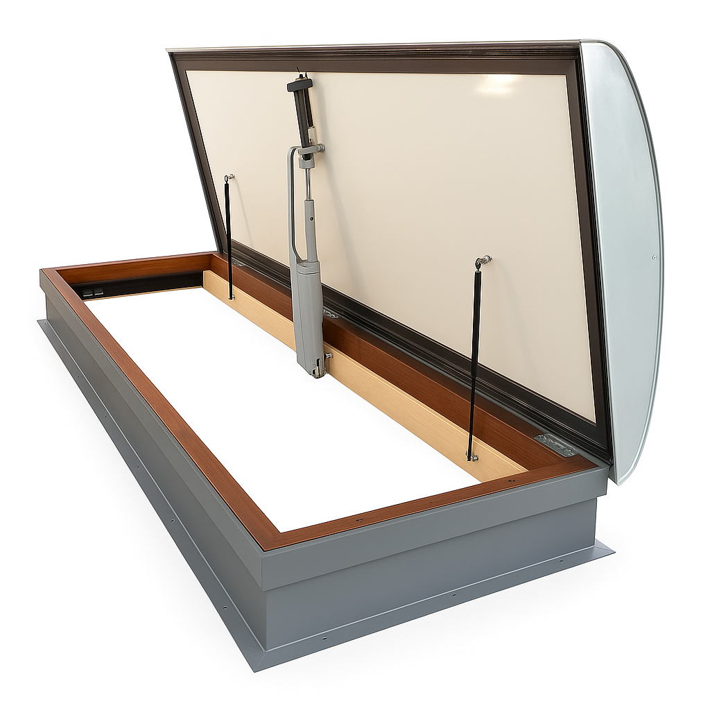 Wyłaz dachowy EI90 to konstrukcja o najwyższej odporności ogniowej, zapewniająca 90 minut ochrony przegrody dachowej. Wykonywany na zamówienie w różnych rozmiarach i wysokościach podstawy, gwarantuje szczelność, izolacyjność cieplną i bezpieczeństwo pożarowe w budynkach przemysłowych, technicznych i użyteczności publicznej.